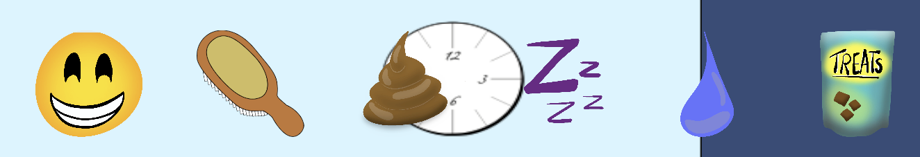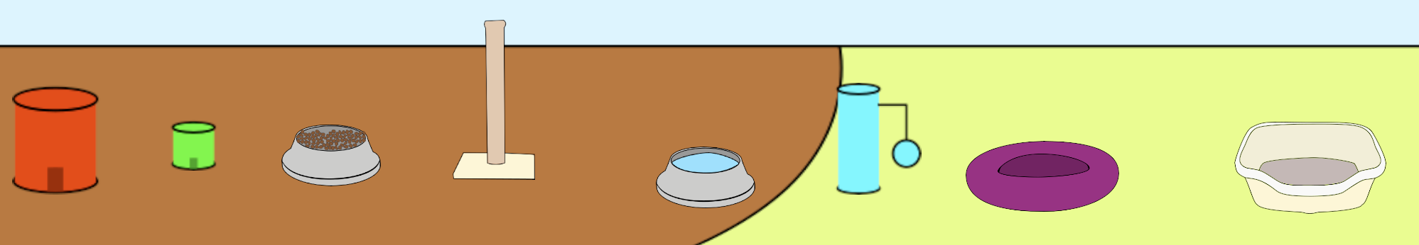 Your cats are smart and will self regulate these needs by using the items you have in your shelter. You can move these about as much as you like by clicking and dragging.